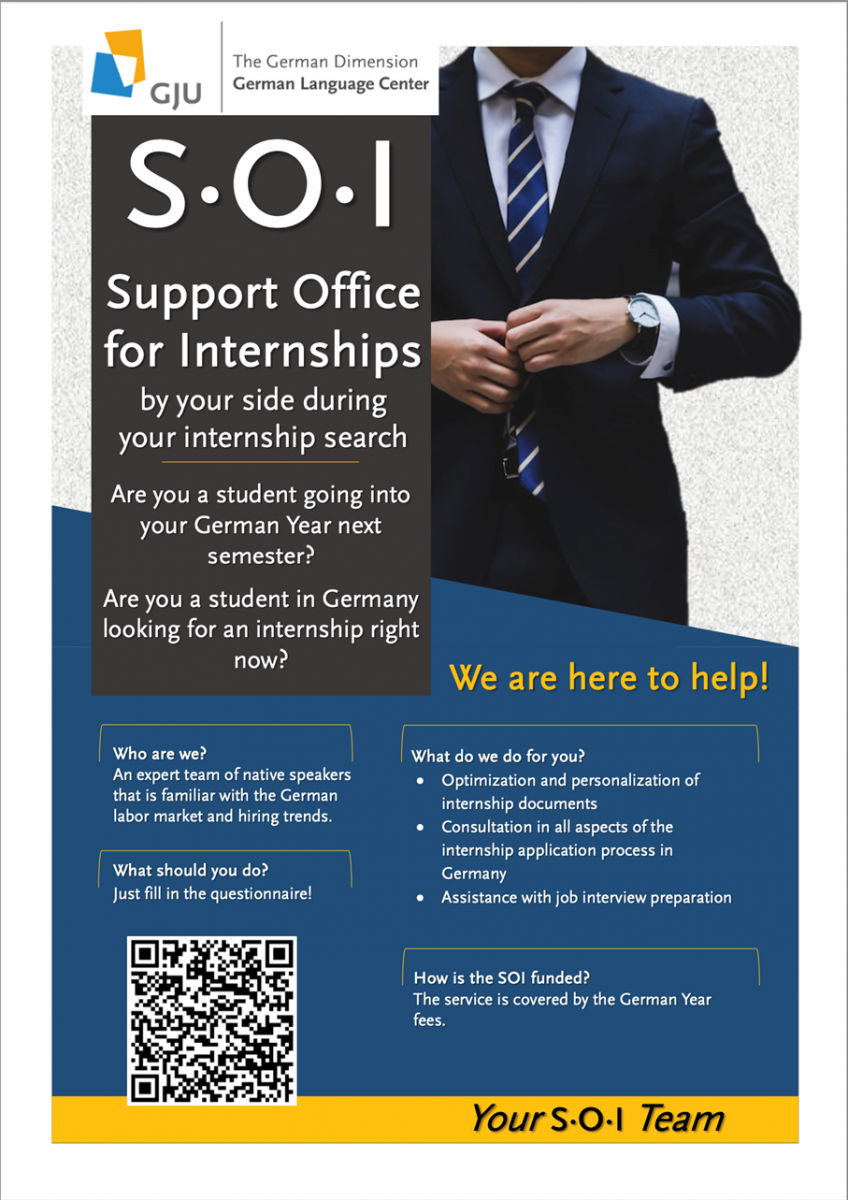 تعتبر عملية التقديم للحصول على تدريب في ألمانيا شيئاً صعبًا وتتطلب إعدادًا مكثفًا. "مكتب الدعم لطلبات التدريب" (SOI) في مركز اللغة الألمانية هو وحدة خدمة مختصة بالتدريب على إعداد مستندات الطلبات للحصول على التدريب الإجباري خلال سنة ألمانيا وتساعد في جميع جوانب البحث عن التدريب. بالإضافة إلى وحدة "التدريب على التطبيق" في المستوى السادس لإعداد مستندات التقديم المكتوبة وإجراء مقابلة العمل، فإن الخدمة هي إجراء آخر لزيادة فرص نجاح الحصول على التدريب الإلزامي في ألمانيا وكخطوة أولى نحو تحقيق مهنة ناجحة.