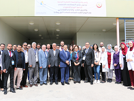 On Thursday, April 25, 2019, The German Jordanian University (GJU) in cooperation with the Specialty Hospital organized a Free Medical Day for the local community in Na’ur and Madaba Governorate, in presence of the President of GJU Prof. ManarFayyad, the General Director of the Specialty Hospital Dr. Fawzi Al-Hammouri and the Director of Jrainah Sub-District Dr. Osama Al-Hashem.