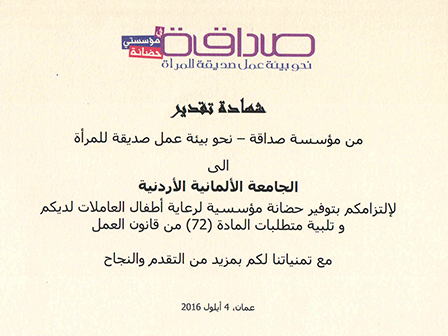 SADAQA-towards a work friendly environment for women in Jordan awarded the German Jordanian University for establishing a daycare for its workers during the Daycare Value on Employers and Awarding Ceremony that was held at Haya Cultural Center on Sunday, September4, 2016.