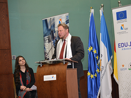 During the ceremony Mr. Köhler praised the Syrian students to finalize their studies in the challenging conditions and lauded the commitment of Jordan to provide a safe learning environment. In addition, Prof. Manar gave a speech about the Syrian crises and how GJU in collaboration with the EU, played a vital role in alleviating the students suffer by providing scholarships. After the three speeches, EDU-SYRIA talented students performed three talent shows in performing a dramatic composition, a musical piece, and delivering a poetry. At the end of the ceremony, Prof. Manar and Mr. Köhler hand over the certificates to EDU-SYRIA students.