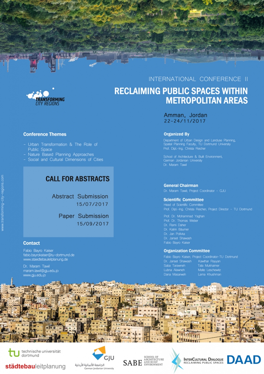 The conference is organized by TU Dortmund University/ Spatial Planning Faculty/ Department of Urban Design and Land-Use Planning in collaboration with German Jordanian University (GJU)/ School of Architecture and Built Environment, and is supported by the German Academic Exchange Service (DAAD).