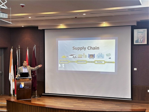 The lecture was delivered by Dr. Imad Hatamleh, Head of the Logistics Science Department at the School of Business at the German Jordanian University (GJU). Dr. Hatamleh highlighted key topics, including the concept of logistics science, the role and importance of the field in supporting various sectors such as industry, trade, and services, as well as the interconnections between these sectors and strategies for effectively managing supply chains and operations.