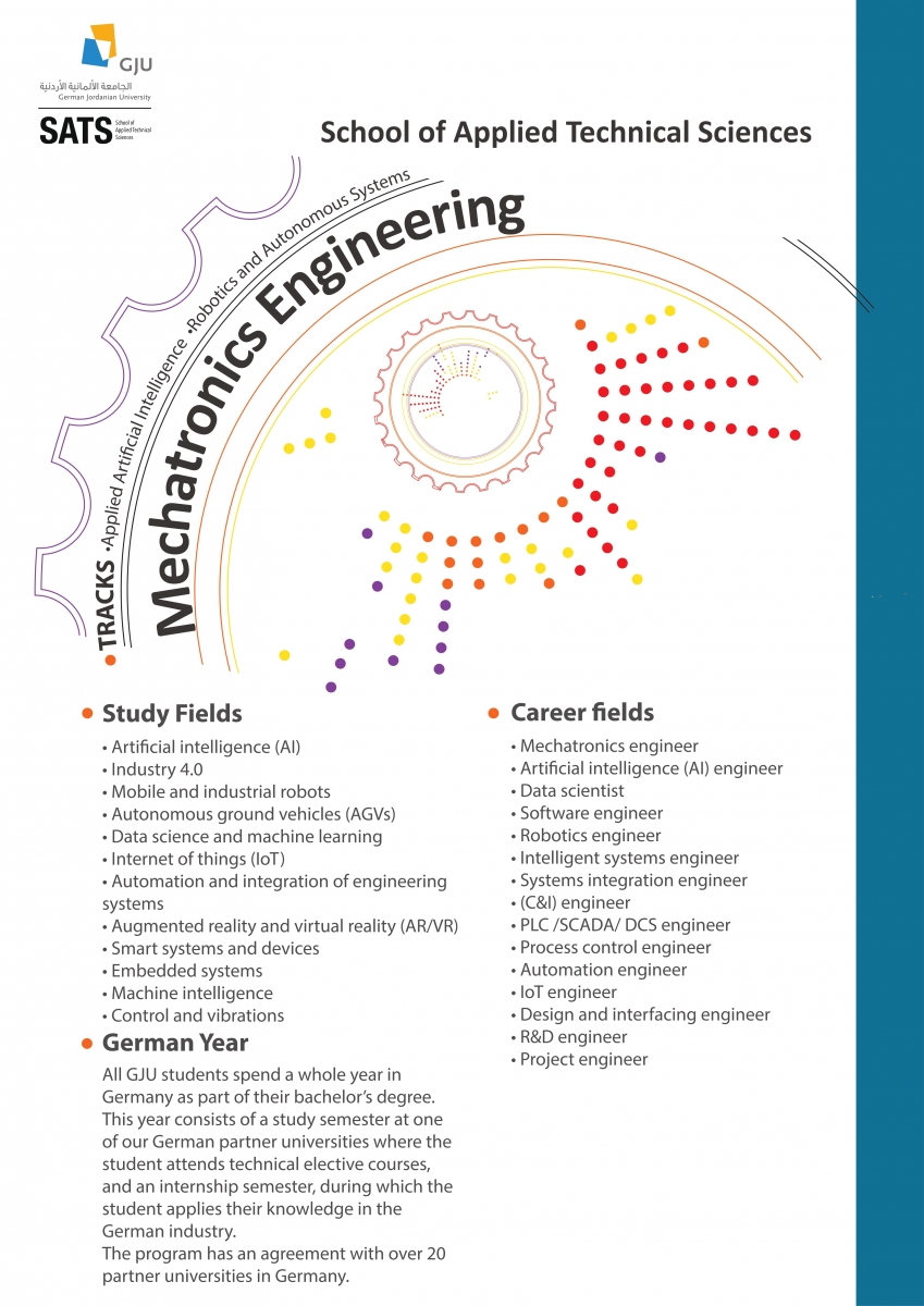 The B.Sc. program in Mechatronics Engineering (ME) provides students with essential skills required for the digital era and the 4th industrial revolution. Engineering applications of the internet of things (IoT), artificial intelligence (AI), robotics, and industrial automation are a major focus of the program, accompanied with capstone projects designed to reinforce learning in these fast-growing fields. The program prepares students technically and professionally to effectively participate in the rapidly occurring digital transformation in industry and business. Graduates are active players in multidisciplinary teams and environments with strong technical and communication skills, reflecting a high level of professionalism and engineering ethics. This program (B.Sc. in Mechatronics Engineering) is accredited by the German Accreditation Council (Stiftung Akkreditierungsrat) and Jordan's AQACHEI.