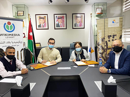 On Thursday, December 17, 2020, the Library at the German Jordanian University (GJU) signed a Memorandum of Understanding (MoU) with Wikimedia Levant (which is a user group working on free knowledge in the Levant area (Jordan, Palestine, Syria and Lebanon) in cooperation with Wikimedia foundation). The MoU was signed by the President of GJU Prof. Manar Fayyad, and Board member of Wikimedia Levant Mr. Nidhal Jarrar, with the presence of the Director of the Library, Dr. Aziz Madi.