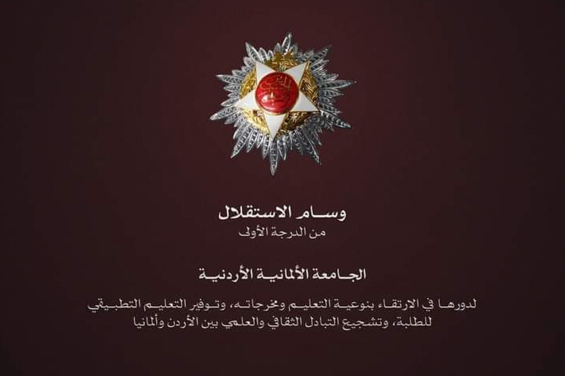His Majesty King Abdullah II has bestowed the Medal of Independence, First Class, upon the German Jordanian University (GJU), recognizing its outstanding contributions to higher education. The prestigious award was received by the University President, Professor Dr. Ala’aldeen Al-Halhouli.