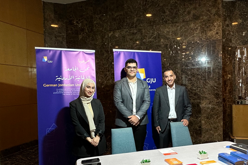 The German Jordanian University (GJU) participated in the university exhibition as part of the "Masarak – Wada’an Tawjihi 2025" career and academic guidance initiative, a program dedicated to advising high school students and BTEC program students in Jordan. This initiative is one of the projects launched by the BTEC Department at the International Standards Academy, under the supervision of the ISO Schools team. The event was held at the Sheraton Hotel – Amman, with the participation of a distinguished group of universities, educational institutions, and guidance organizations.