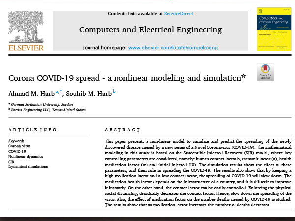 Professor Ahmad Harb, a faculty member in the School of Natural Resources Engineering and Management (SNREM) – Energy Engineering Department, at the German Jordanian University (GJU) published a new research in Elsevier journal research on Corona COVID-19 spread - a nonlinear modeling and simulation.