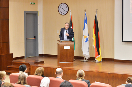 Prof. Finkeldey and Hegemann addressed the students with words of encouragements and advise. They stressed the importance of benifiting from the German Year especially in learning the language, the culture and making new friends. Moreover, Hegemann advised the students to develop a transcultural personality able to work in many fields, able to live in two worlds, as GJU became a well-known brand in the last 18 years that stand for the highest employability rate in Jordan and innovation and thinking out of the box.