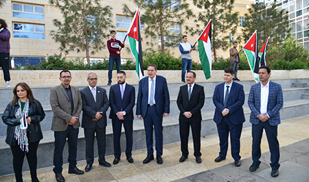 The German Jordanian University (GJU), through the Deanship of Student Affairs (DSA), organized a stand in solidarity for the martyrs of Public Security who sacrificed themselves to preserve the security and safety of the homeland in the presence of the University President, Prof. Ala’aldeen Al-Halhouli.