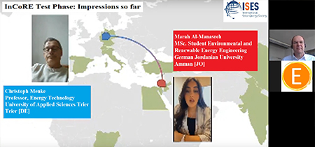 Eng. Maraah Al-Manasrah, a Master's student in the German Jordanian University, Environmental and Renewable Energy Engineering, participated in the Solar World Congress 2021 to talk about her impressions so far on the latest educational initiative by the ISES. Maraah shared about her experience and said " I was incredibly thrilled to be chosen to participate at the Solar World Congress 2021, where ISES President Prof. Klaus Vajen welcomed me and introduced me to talk about my experience with InCoRE; the International Solar Energy Society's most recent educational program.