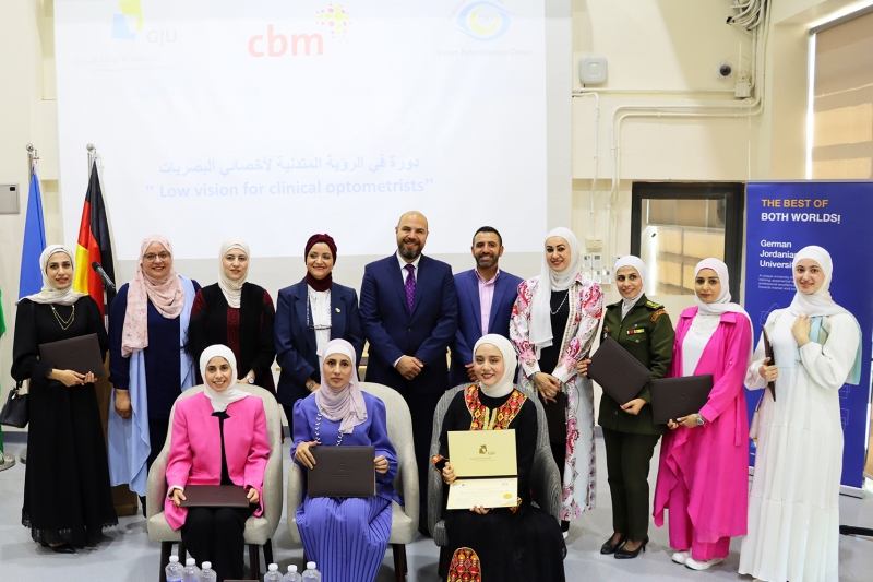 The GJU Vision Rehabilitation Center celebrated the graduation of participants in the Low Vision Course for Clinical Optometrists, representing optometrists from the Ministry of Health, the Jordanian Royal Medical Services, and the private sector.