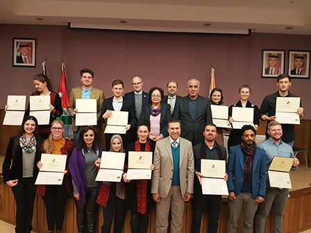 The ceremony included a speech by German student that he expressed his happiness at the completion of the program, stressing its importance in gaining new experiences such as familiarizing the students with Arab customs and traditions, folk songs, food and the archaeological and historical places in Jordan. The ceremony also included a theatrical performance, poems and Arabic songs performed by the students.