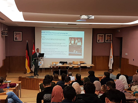 On Monday, February 24, 2020, a delegation from Khalifa University of Science and Technology (KU) Abu Dhabi- United Arab Emirates visited the German Jordanian University (GJU) to attract GJU's students to KU's distinctive Master's and Ph.D. programs and scholarships.