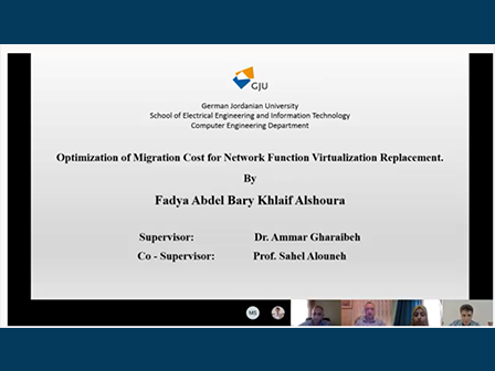 Student Fadia Alshoura from the School of Electrical Engineering and Information Technology (SEEIT) - Computer Engineering Department at the German Jordanian University (GJU) defended her Master thesis entitled “ Optimization of Migration Cost for Network Function Virtualization Replacement”.