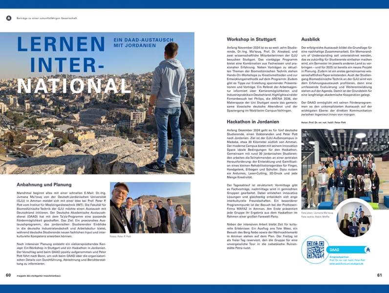 The Mechanical Engineering Magazine at the University of Stuttgart, Germany, published an article about a distinguished academic exchange project between the German Jordanian University (GJU) and the University of Stuttgart, supported by the German Academic Exchange Service (DAAD).